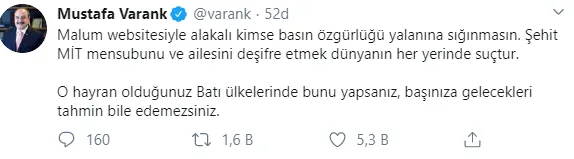 Sanayi ve Ticaret Bakanı Mustafa Varank, Oda TV'nin "Libya şehidi MİT mensubunun cenaze görüntülerine Odatv ulaştı" başlıklı haberine tepki gösterdi. Varank, sosyal paylaşım sitesi Twitter'daki şahsi hesabından;"Malum websitesiyle alakalı kimse basın özgürlüğü yalanına sığınmasın. Şehit MİT mensubunu ve ailesini deşifre etmek dünyanın her yerinde suçtur. O hayran olduğunuz Batı ülkelerinde bunu yapsanız, başınıza gelecekleri tahmin bile edemezsiniz" ifadelerini kullandı.