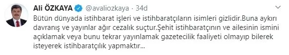 AK Parti Afyonkarahisar Milletvekili ve Cumhurbaşkanı Recep Tayyip Erdoğan'ın eski avukatı Ali Özkaya, sosyal paylaşım sitesi Twitter'daki şahsi hesabından, Oda TV'nin haberine tepki gösterdi. Özkaya, "Bütün dünyada istihbarat işleri ve istihbaratçıların isimleri gizlidir. Buna aykırı davranış ve yayınlar ağır cezalık suçtur. Şehit istihbaratçının ve ailesinin ismini açıklamak veya bunu tekrar yayınlamak gazetecilik faaliyeti olmayıp bilerek isteyerek istihbaratçılık yapmaktır..." ifadelerini kullandı..
