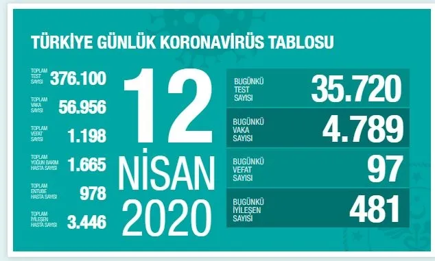 Tüm dünyada etkisini sürdüren corona virüs yüzünden ülkemizde hayatını kaybedenlerin sayısı 1.198 oldu. 12 Nisan Türkiye corona virüs il il vaka ve ölüm son durumu hakkında son dakika bilgileri geliyor. Dün toplamda 35 bin 720 test yapıldı, vaka sayısı 4.789 oldu. 97 vatandaşımız hayatını kaybederken dün iyileşenlerin sayısı 481 oldu. 56.956 corona virüs hastasının olduğu ülkemizde vaka ve ölü sayısında bir numarada İstanbul var. İstanbul'un en riskli ilçeleri arasında da Esenyurt, Esenler, Bağcılar ve Bahçelievler var. Sağlık Bakanlığı tarafından açıklanan vaka analizinde de bu ilçelerin yanı sıra Güngören, Zeytinburnu, Bakırköy, Beşiktaş, Kadıköy, Şişli, Üsküdar, Ümraniye gibi kalabalık ilçelerde de vakaların çok olduğu ifade edilmişti. Son dakika; il il corona virüs vaka ve ölü sayısı son durum ne?