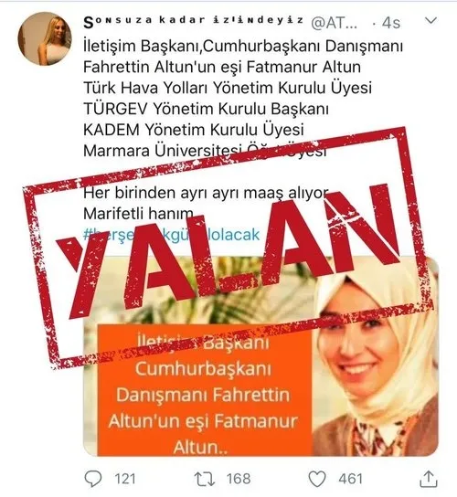 Cumhurbaşkanlığı İletişim Başkanı Prof. Dr. Fahrettin Altun’un ardından şimdi de eşi Fatmanur Altun yalan haberlerle hedef alınıyor!