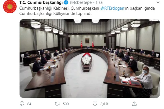 Cumhurbaşkanlığı Kabinesi, Başkan Recep Tayyip Erdoğan liderliğinde toplandı. Koronavirüs salgını başta olmak üzere son durum değerlendirmelerinin gerçekleştiği toplantının ardından Başkan Erdoğan ulusa seslendi.