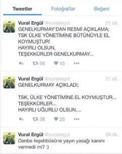 Sanığın, "@VuralErgul2" isimli hesaptan 15 Temmuz kanlı darbe girişimi sırasında " GENELKURMAYDAN RESMİ AÇIKLAMA; TSK ÜLKE YÖNETİMİNE BÜTÜNÜYLE EL KOYMUŞTUR. HAYIRLI OLSUN, TEŞEKKÜRLER GENELKURMAY...", "GENELKURMAY AÇIKLADI; TSK ÜLKE YÖNETİMİNE EL KOYMUŞTUR... TEŞEKKÜRLER... HAYIRLI OLSUN... ", " YURTTASULHKONSEYİ İŞBAŞINDA!:)))) ", "BİN YAŞA" şeklinde ve 17 Temmuz 2016 tarihinde "#YURTTASULHKONSEYİ İstanbul semalarında savaş uçakları alçak uçuşta! :))); Eyyyyyyyyyyyy! #YURTTASULHKONSEYİ nerede kaldın? Niye geç kaldın! :))); DİKKAT! DİKKAT! DİKKAT! #YURTTASULHKONSEYİ DİKKAT! DİKKAT! DİKKAT! SIKI YÖNETİM İLAN OLDU... SOKAĞA ÇIKMA YASAĞI KONULDU!" şeklinde darbecilere övgü içerikli ifadeler paylaşımlarda bulunduğu saptandı.