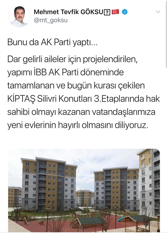 CHP’li Ekrem İmamoğlu, AK Partili büyükşehir belediyesi tarafından yapımı tamamlanan KİPTAŞ, Silivri Konutları 3. etap projesini de sahiplenerek “Konutların yapımı bitti” dedi. Esenler Belediye Başkanı Mehmet Tevfik Göksu ise buna tepki gösterdi. Göksu, sosyal medya hesabından “Bunu da AK Parti yaptı... Dar gelirli aileler için projelendirilen, yapımı İBB AK Parti döneminde tamamlanan ve bugün kurası çekilen KİPTAŞ Silivri Konutları 3. Etaplarında hak sahibi olmayı kazanan vatandaşlarımıza yeni evlerinin hayırlı olmasını diliyoruz” dedi