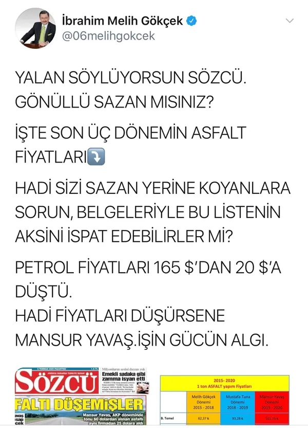 Gökçek ayrıca konuyu manşetine taşıyarak algıya ortak olan Sözcü'ye de tepki gösterdi. Melih Gökçek paylaşımında şunları söyledi: "Yalan söylüyorsun Sözcü. Gönüllü sazan mısınız? Hadi sizi sazan yerine koyanlara sorun, belgeleriyle bu listenin aksini ispat edebilirler mi? Petrol fiyatları 165 $'dan 20 $'a düştü. Hadi fiyatları düşürsene Mansur Yavaş… İşin gücün algı."