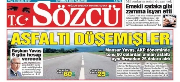 CHP'li Ankara Büyükşehir Belediyesi Başkanı Mansur Yavaş, Başkent genelinde faaliyet gösteren 13 Organize Sanayi Bölgesi'nin yöneticileriyle bir araya geldiği toplantıda "AKP döneminde tonu 60 dolardan alınan asfaltı, aynı firmadan 25 dolara alıyoruz" dedi. AK Parti eski Ankara Büyükşehir Belediye Başkanı İbrahim Melih Gökçek, Yavaş'ın bu ifadesini sosyal medyadan paylaşarak tepki gösterdi.