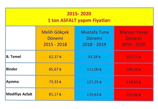 Aynı tabloda Mansur Yavaş'ın fiyatları şoke etti. Yavaş'ın 1 ton asfaltı 101,75 lira ile 155,96 lira arasında döşettiği görüldü.