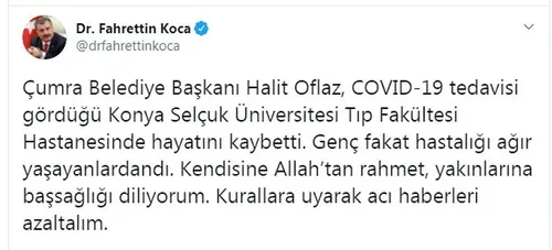 Sağlık Bakanı Fahrettin Koca, yeni tip koronavirüs (Kovid-19) tedavisi gördüğü hastanede hayatını kaybeden Çumra Belediye Başkanı Halit Oflaz için taziye mesajı paylaştı.