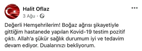 Oflaz, hastalığa yakalanmasının ardından 3 Ağustos'ta sosyal medya hesabından yaptığı açıklamada, "Değerli hemşehrilerim, boğaz ağrısı şikayetiyle gittiğim hastanede yapılan Kovid-19 testim pozitif çıktı. Allah'a şükür sağlık durumum iyi ve tedavim devam ediyor. Dualarınızı bekliyorum." ifadelerini kullanmıştı.