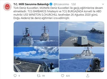 Milli Savunma Bakanlığı Twitter'dan yaptığı açıklamada, "Türk Deniz Kuvvetleri, Müttefik Deniz Kuvvetleri ile geçiş eğitimlerine devam etmektedir. TCG BARBAROS fırkateyni ve TCG BURGAZADA korveti ile ABD muhribi USS WINSTON S.CHURCHILL tarafından 26 Ağustos 2020 günü, Doğu Akdeniz'de deniz eğitimleri icra edilmiştir." dedi.