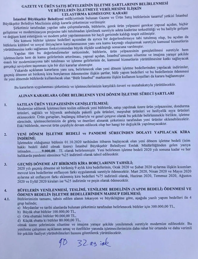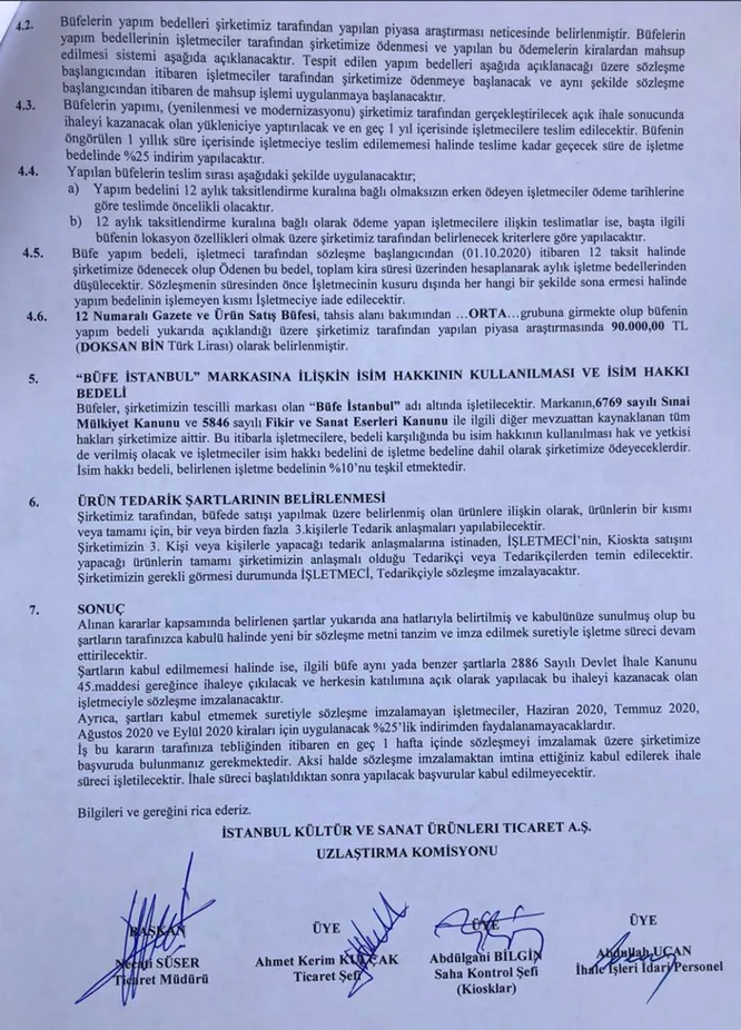 Ayrıca İstanbul Kültür ve Sanat Ürünleri Ticareti A.Ş Uzlaştırma Komisyonu'nun imzalarının bulunduğu belgede, kararın tebliğinden itibaren bir hafta içerisinde büfe sahiplerinin sözleşmeyi imzalayarak şirkete başvuru yapmaları gerektiği ifade edildi.