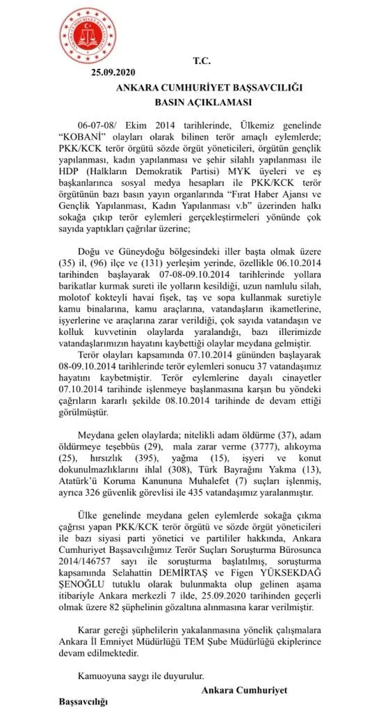 Açıklamanın devamında ise şu ifadeler yer aldı, "Ülke genelinde meydana gelen eylemlerde sokağa çıkma çağrısı yapan PKK/KCK terör örgütü ve sözde örgüt yöneticileri ile bazı siyasi parti yönetici ve partililer hakkında, Ankara Cumhuriyet Başsavcılığımız Terör Suçları Soruşturma Bürosunca 2014/146757 sayı ile soruşturma başlatılmış, soruşturma kapsamında Selahattin Demirtaş ve Figen Yüksekdağ Şenoğlu tutuklu olarak bulunmakta olup gelinen aşama itibariyle Ankara merkezli 7 ilde, 25.09.2020 tarihinden geçerli olmak üzere 82 şüphelinin gözaltına alınmasına karar verilmiştir.