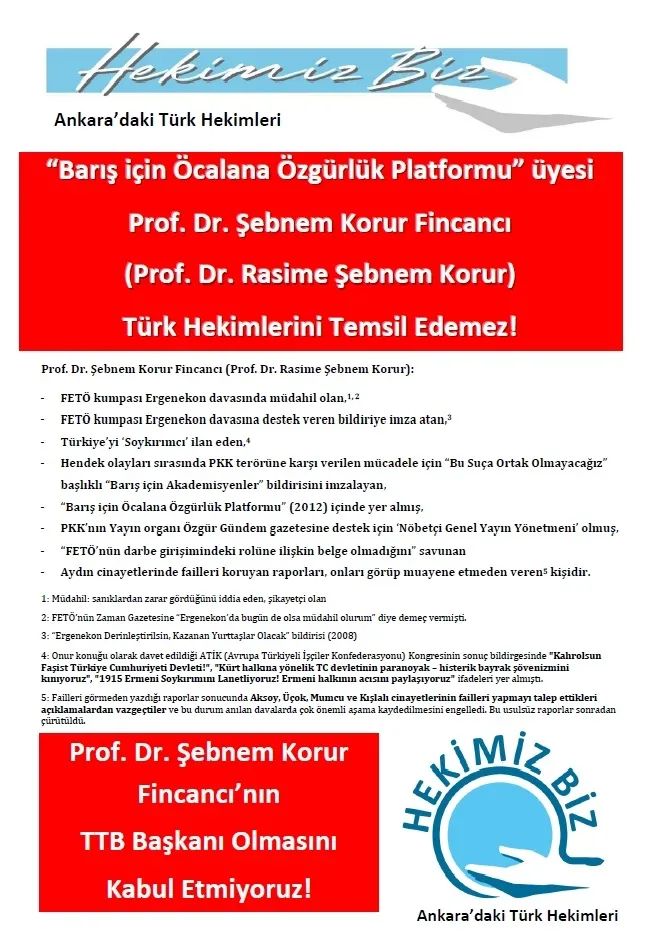 "Prof. Dr. Şebnem Korur Fincancı'nın TTB Başkanı olmasını kabul etmiyoruz" diyen Ankara'daki Türk Hekimleri 'Hekimiz Biz' yayımladığı bildiride şunları söyledi:
