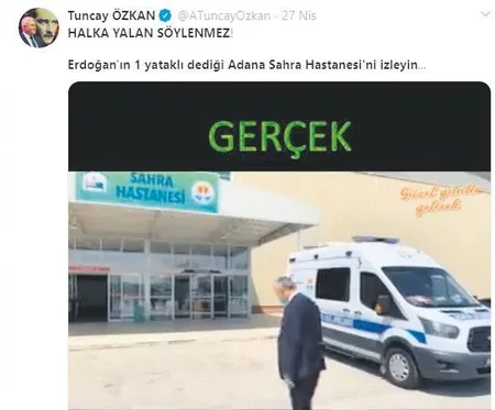 CHP Genel Başkan Yardımcısı Tuncay Özkan da; 27 Nisan 2020 tarihinde Twitter hesabından yaptığı açıklamada "Halka yalan söylenmez! Erdoğan'ın 1 yataklı dediği Adana Sahra Hastanesi'ni izleyin..." diyerek paylaşımda bulunmuştu.