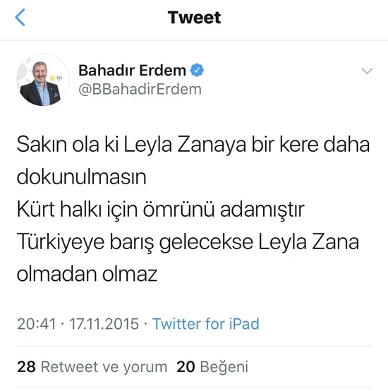 "Sakın ola ki Leyla Zana'ya bir kere daha dokunulmasın. Kürt halkı için ömrünü adamıştır. Türkiye'ye barış gelecekse Leyla Zana olmadan olmaz."