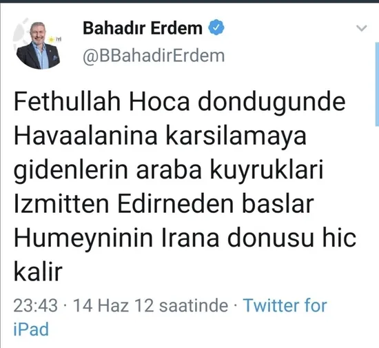 "Fetullah Hoca döndüğünde havaalanına karşılamaya gidenlerin araba kuyrukları İzmit'ten Edirne'den başlar, Humeyni'nin İran'a dönüşü hiç kalır."