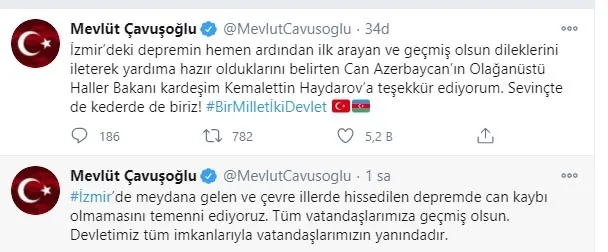 Bakan Çavuşoğlu, "İzmir'deki depremin hemen ardından ilk arayan ve geçmiş olsun dileklerini ileterek yardıma hazır olduklarını belirten Can Azerbaycan'ın Olağanüstü Haller Bakanı kardeşim Kemalettin Haydarov'a teşekkür ediyorum. Sevinçte de kederde de biriz" dedi.
