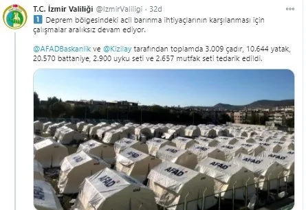Açıklamada "AFAD ve Türk Kızılay tarafından toplamda 3 bin 9 çadır, 10 bin 644 yatak, 20 bin 570 battaniye, 2 bin 900 uyku seti ve 2 bin 657 mutfak seti tedarik edildi. Vatandaşlarımızın barınma ihtiyaçlarının karşılanması amacıyla Bornova Jimnastik Spor Salonu ve Bornova Hüseyin Öğütcen Spor Salonu tahsis edildi. Ayrıca Aşık Veysel ve Ege Üniversitesi alanlarına çadır kurulumu gerçekleştirildi." ifadeleri kullanıldı.