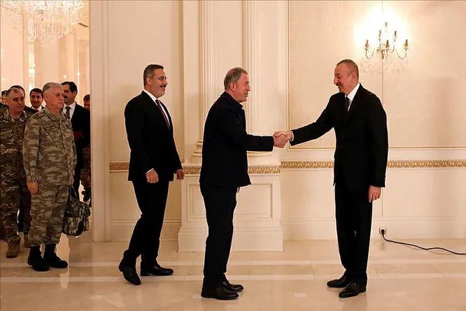 Azerbaycan Cumhurbaşkanı İlham Aliyev, Dışişleri Bakanı Mevlüt Çavuşoğlu, Milli Savunma Bakanı Hulusi Akar, Kara Kuvvetleri Komutanı Orgeneral Ümit Dündar ve Milli İstihbarat Teşkilatı (MİT) Başkanı Hakan Fidan'ı kabul etti. Azerbaycan’ın Dağlık Karabağ’da elde ettiği zaferin ardından ilk görüşmesini gerçekleştirdiğini belirten Aliyev, "Bu görüşme de elbette kardeşlerimle birlikte oluyor. Bugün Cumhurbaşkanı Recep Tayyip Erdoğan ile görüştüm ve ileride yapacağımız çalışmalarımızı istişare ettik." dedi.