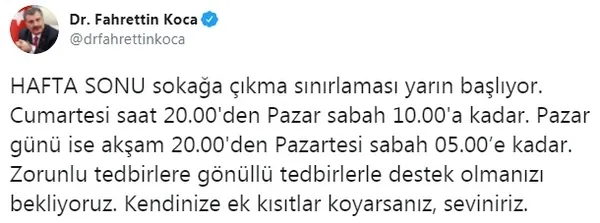 Bakan Fahrettin Koca, Twitter hesabından sokağa çıkma yasağı ile ilgili bir paylaşımda bulundu. Bakan Koca paylaşımında, "Cumartesi saat 20.00'den pazar sabah 10.00'a kadar. Pazar günü ise akşam 20.00'den pazartesi sabah 05.00'e kadar. Zorunlu tedbirlere gönüllü tedbirlerle destek olmanızı bekliyoruz. Kendinize ek kısıtlar koyarsanız, seviniriz" ifadelerini kullandı.