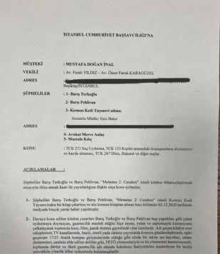 Avukat Mustafa Doğan İnal; Oda TV Genel Yayın Yönetmeni Barış Pehlivan, Oda TV Sorumlu Haber Müdürü Barış Terkoğlu ve Kırmızı Kedi Yayınevi yetkilileri hakkında İstanbul Cumhuriyet Başsavcılığı'na suç duyurusunda bulundu.