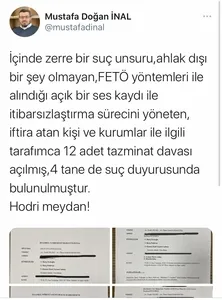 "İçinde zerre bir suç unsuru, ahlak dışı bir şey olmayan, FETÖ yöntemleri ile alındığı açık bir ses kaydı ile itibarsızlaştırma sürecini yöneten, iftira atan kişi ve kurumlar ile ilgili tarafımca 12 adet tazminat davası açılmış, 4 tane de suç duyurusunda bulunulmuştur. Hodri meydan!"