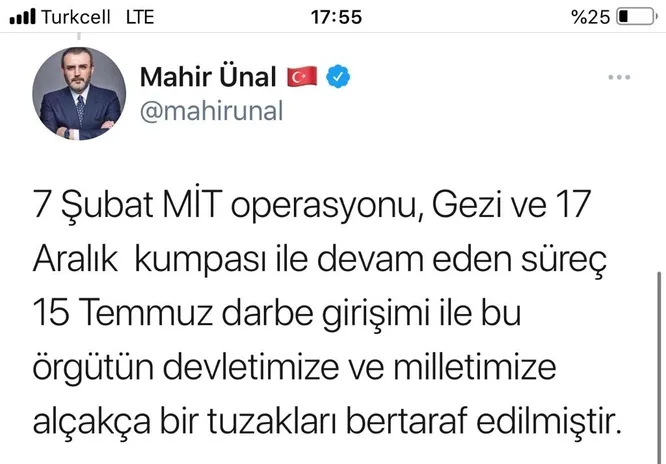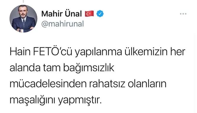 "Hain FETÖ'cü yapılanma ülkemizin her alanda tam bağımsızlık mücadelesinden rahatsız olanların maşalığını yapmıştır. 7 Şubat MİT operasyonu, Gezi ve 17 Aralık kumpası ile devam eden süreç 15 Temmuz darbe girişimi ile bu örgütün devletimize ve milletimize alçakça bir tuzakları bertaraf edilmiştir."