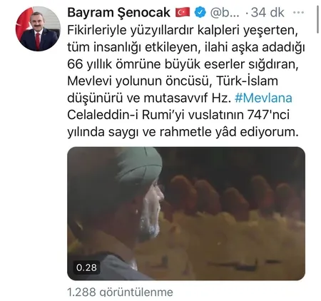 AK Parti İstanbul İl Başkanı Bayram Şenocak ise "Fikirleriyle yüzyıllardır kalpleri yeşerten, tüm insanlığı etkileyen, ilahi aşka adadığı 66 yıllık ömrüne büyük eserler sığdıran, Mevlevi yolunun öncüsü, Türk-İslam düşünürü ve mutasavvıf Hz. Mevlana Celaleddin-i Rumi'yi vuslatının 747'nci yılında saygı ve rahmetle yâd ediyorum" dedi.