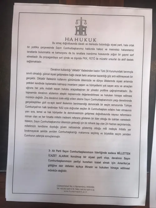Erdoğan'ın avukatı Hüseyin Aydın, dün verdiği tazminat davası dilekçesinde "Davalının ve mensubu bulunduğu siyasi partinin Sayın Cumhurbaşkanımıza yönelik ısrarlı şekilde ve hakaret kastı ile 'diktatör' yakıştırmasında bulunması uzun süredir yurt içinde ve yurt dışında kabul ettirilmeye çalışılan algı operasyonunun ve otoriterlik propagandasının bir yansımasıdır" ifadelerini kullandı. Aydın dilekçesinde şunları kaydetti: