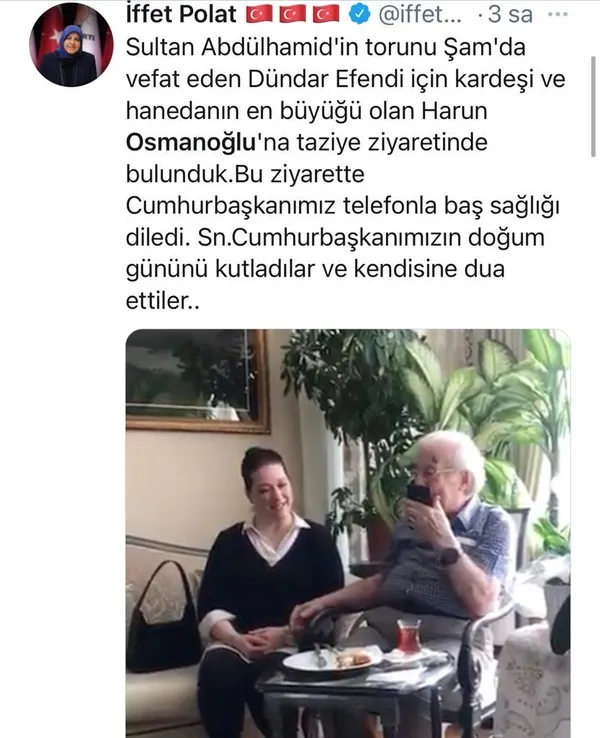 Harun Osmanoğlu'na taziye ziyareti yapan AK Parti İstanbul Milletvekili İffet Polat, Başkan Recep Tayyip Erdoğan'ın başsağlığı dilediği görüntüleri paylaşarak şunları yazdı: "Sultan Abdülhamid'in torunu Şam'da vefat eden Dündar Efendi için kardeşi ve hanedanın en büyüğü olan Harun Osmanoğlu'na taziye ziyaretinde bulunduk. Bu ziyarette Cumhurbaşkanımız telefonla baş sağlığı diledi. Sayın Cumhurbaşkanımızın doğum gününü kutladılar ve kendisine dua ettiler."