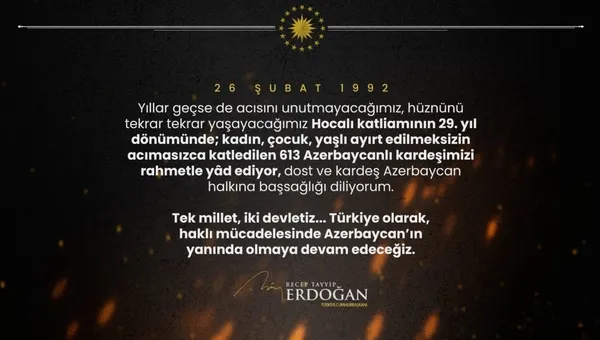 Başkan Erdoğan "29 yıl önce Hocalı'da hunharca katledilen Azerbaycanlı kardeşlerimizi rahmetle yâd ediyorum..." ifadelerini kullandı.