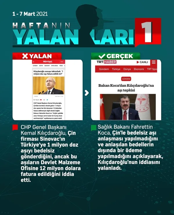 Sosyal paylaşım sitesi Twitter’da 1-7 Mart 2021 tarihinde söylenen en büyük beş yalan paylaşıldı. CHP Genel Başkanı Kemal Kılıçdaroğlu’nun Çin aşısına ilişkin açıklamaları, İstanbul Büyükşehir Belediye Başkanı Ekrem İmamoğlu’nun, Kasımpaşa'daki Divanhane'nin yıkılmaya başladığına yönelik iddiası ve CHP eski Milletvekili Eren Erdem’in çıplak aramaya ilişkin açıklamalarının yalan olduğu gözler önüne serildi.