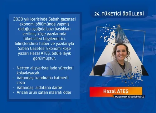 Tüketicinin korunması, bilinçlendirilmesi, yasal haklarını kullanması konusunda özendirilmesi, tüketici talep ve tercihlerini dikkate alan çalışmaların teşviki için Bakanlık tarafından düzenlenen "Tüketici Ödülleri" kapsamında Sabah Gazetesinden Hazal Ateş 2020 yılı "Yazılı Basın Tüketici Ödülü"nü aldı.