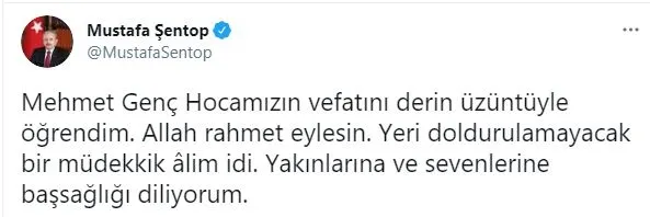 TBMM Başkanı Mustafa Şentop da taziye mesajı yayınladı. Şentop mesajında; Mehmet Genç Hocamızın vefatını derin üzüntüyle öğrendim. Allah rahmet eylesin. Yeri doldurulamayacak bir müdekkik âlim idi. Yakınlarına ve sevenlerine başsağlığı diliyorum.