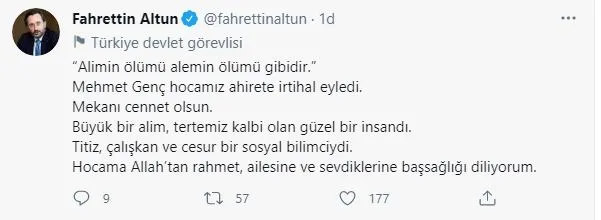İletişim Başkanı Fahrettin Altun da taziye mesajı yayınladı. Altun mesajında; "Alimin ölümü alemin ölümü gibidir." Mehmet Genç hocamız ahirete irtihal eyledi. Mekanı cennet olsun. Büyük bir alim, tertemiz kalbi olan güzel bir insandı. Titiz, çalışkan ve cesur bir sosyal bilimciydi. Hocama Allah'tan rahmet, ailesine ve sevdiklerine başsağlığı diliyorum.