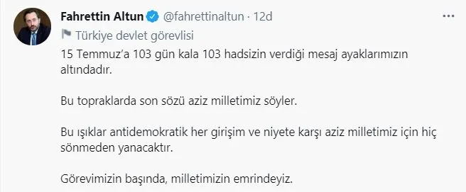 Altun sözlerini şöyle tamamladı; 15 Temmuz'a 103 gün kala 103 hadsizin verdiği mesaj ayaklarımızın altındadır. Bu topraklarda son sözü aziz milletimiz söyler. Bu ışıklar antidemokratik her girişim ve niyete karşı aziz milletimiz için hiç sönmeden yanacaktır. Görevimizin başında, milletimizin emrindeyiz.