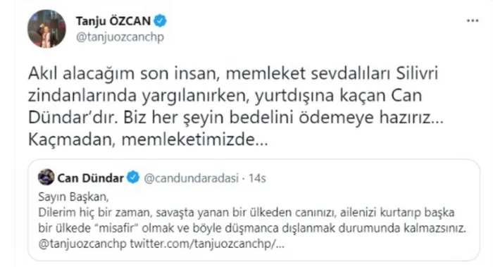 Dündar'ın Özcan'a söylediği sözlere Özcan sosyal medya hesabından anından cevap verdi. Özcan, Dündar'ın yazdıklarını alıntılayarak, "Akıl alacağım son insan, memleket sevdalıları Silivri zindanlarında yargılanırken, yurt dışına kaçan Can Dündar'dır. Biz her şeyin bedelini ödemeye hazırız… Kaçmadan, memleketimizde…" ifadelerine yer verdi.