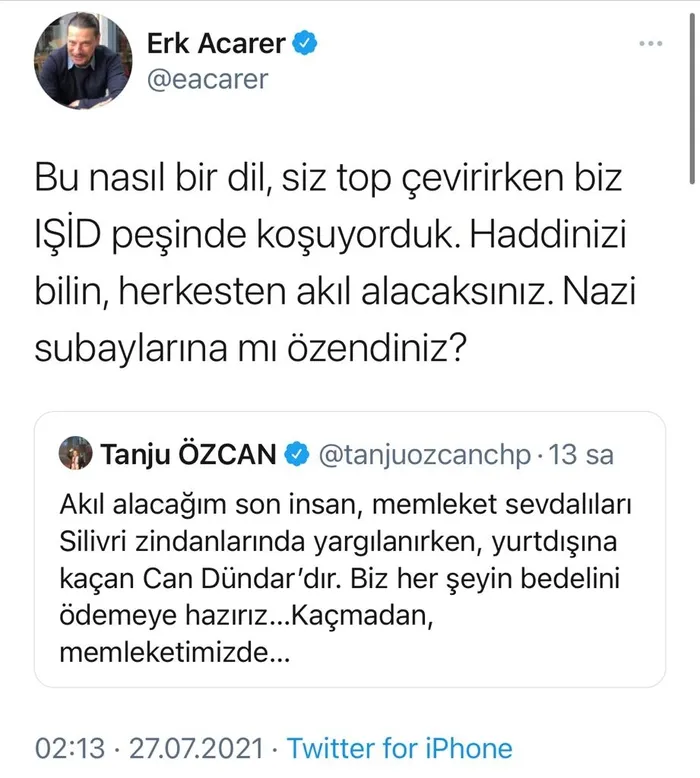 Özcan'a tepkilere yeni bir cephe daha açıldı. MİT TIR'ları davasında devletin gizli belgelerini elde edip yayınlamaktan ceza alan firari Can Dündar, Almanya'da yaşayan Birgün yazarı Erk Acarer ile Tanju Özcan sosyal medyada birbirine girdi.