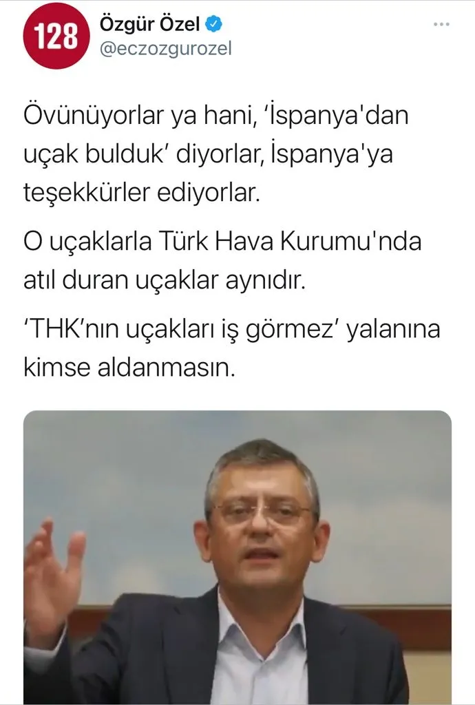 CHP Grup Başkanvekili Özgür Özel ise sosyal medya hesabından THK uçakları üzerinden yeni bir algı operasyonuna girişti. Özel, CHP Genel Başkanı Kılıçdaroğlu'nun şu anda hangarda kullanılabilir uçak olmadığına dair açıklamasına rağmen, "Övünüyorlar ya hani, 'İspanya'dan uçak bulduk' diyorlar, İspanya'ya teşekkürler ediyorlar. O uçaklarla Türk Hava Kurumu'nda atıl duran uçaklar aynıdır. 'THK'nın uçakları iş görmez' yalanına kimse aldanmasın!" dedi.