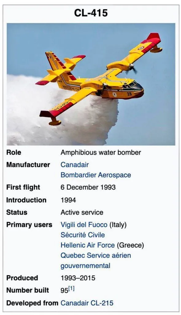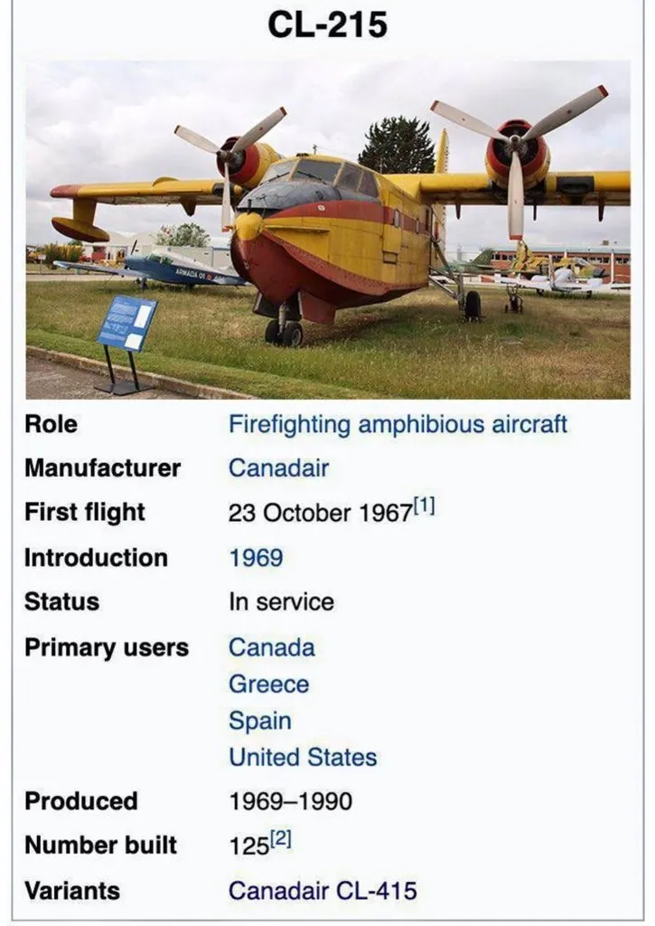 THK'daki uçak CL-215 model amfibyen uçak, 1960 yılında üretilmeye başlandı. İspanya'dan yangın söndürme çalışmaları için gönderilen uçak ise 1993 yılında üretilmeye başlandı ve uçağın modeli CL-415.