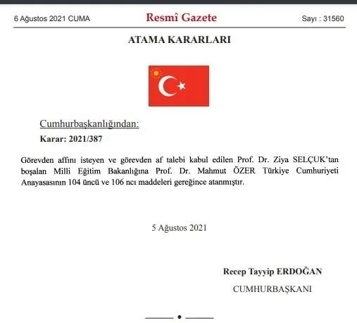 Cumhurbaşkanlığı kararıyla Milli Eğitim Bakanı Ziya Selçuk'tan boşalan göreve Mahmut Özer atandı. Resmi Gazetede yer alan karar sonrası yeni Milli Eğitim Bakanı Mahmut Özer ile ilgili detaylar merak konusu olarak Mahmut Özer kimdir, kaç yaşında, nereli? şeklindeki sorulara yanıt aranmaya başlandı.