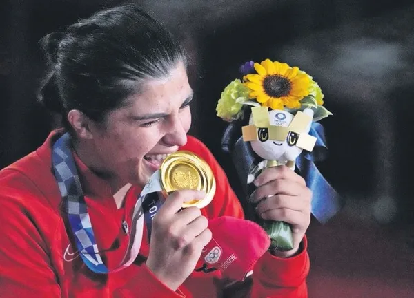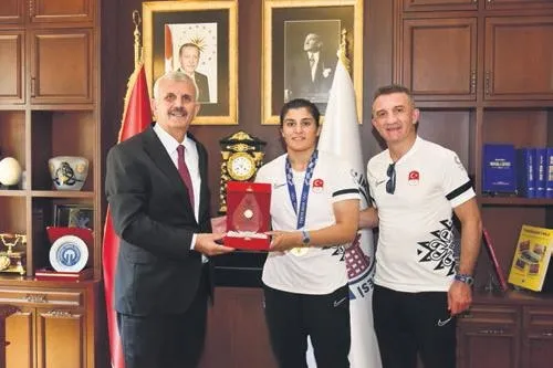 Japonya'da düzenlenen 2020 Tokyo Olimpiyatları'nda kürsüde ay yıldızlı bayrağı dalgalandırırken gözyaşlarını tutamayan milli boksör Busenaz Sürmeneli, altın madalya kazanarak Türkiye'nin olimpiyat tarihine adını altın harflerle yazdırdı. Yarı final maçını kazandıktan sonra, "O yangınları çıkaranlar iyi bilsin; biz bir ölür bin diriliriz" sözleriyle ekran başındaki milyonların tüylerini diken diken eden Altın Yumruk Busenaz, ailesine ve ülkesine verdiği altın madalya sözünü de bileğinin gücüyle tutmuş oldu. Busenaz Sürmeneli dün İstanbul Bahçelievler Belediye Başkanı Dr. Hakan Bahadır'ı makamında ziyaret etti. Başkan Bahadır milli boksöre ve antrenörü Cahit Süme'ye Cumhuriyet altını hediye etti.