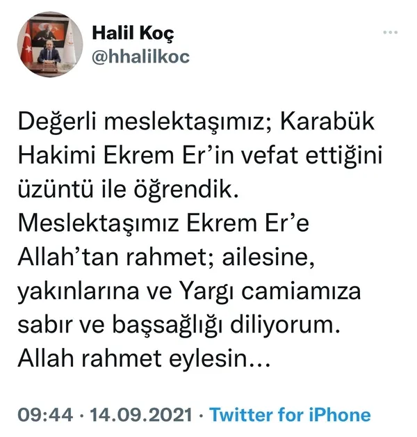HSK 1. Daire Başkanı Halil Koç da sosyal medya hesabından yaptığı açıklamada Ekrem Er'in vefat haberini paylaşarak ailesine, yakınlarına ve yargı camiasına başsağlığı dileklerinde bulundu.