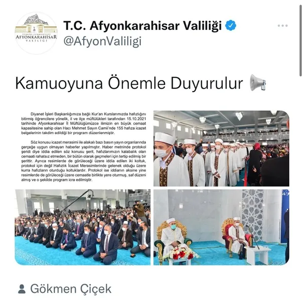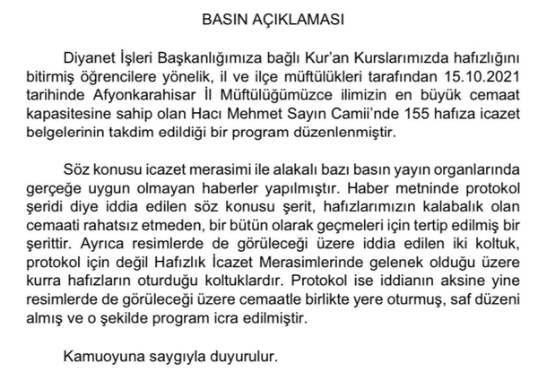 Sözcü ve Birgün gazetelerinin “Afyon’da camide protokol yolu açıldı” diye lanse ettiği cami içindeki yolun “Hafızlık İcazet Merasimi” için açıldığı, her hafızlık icazet merasiminde camilerde böyle bir yolun açıldığı, rutin bir uygulama olduğu ve hafızların da icazetlerini alması için bu yolu kullandığı ortaya çıktı. Afyonkarahisar Valiliği, haberleri yalanlayarak sosyal medyadan şu açıklamayı yaptı: “Haber metninde protokol şeridi diye iddia edilen söz konusu şerit, hafızlarımızın kalabalık olan cemaati rahatsız etmeden bir bütün olarak geçmeleri için tertip edilmiş bir şerittir. Ayrıca resimlerde de görüleceği üzere iddia edilen iki koltuk, protokol için değil Hafızlık İcazet Merasimleri’nde gelenek olduğu üzere kurra hafızların oturduğu koltuklardır. Protokol ise iddianın aksine yine resimlerde de görüleceği üzere cemaatle birlikte yere oturmuş, saf düzeni almış ve o şekilde program icra edilmiştir.”