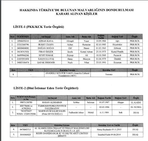 Bakanlığın Resmi Gazete'de yayımlanan kararına göre, Terörizmin Finansmanının Önlenmesi Hakkında Kanun kapsamında "terörün finansmanı" suçu kapsamına giren fiilleri gerçekleştirdikleri hususunda makul sebeplerin varlığına istinaden bazı dernek, şahıs ve şirketlerin mal varlığı donduruldu. Bu çerçevede, terör örgütü PKK/KCK'ye finansman sağladığı yönünde makul sebepler dikkate alınarak kuruluş yeri Toronto olan Anadolu Kültür Vakfı ve 7 kişinin Türkiye'de bulunan mal varlıklarının dondurulması kararı alındı.