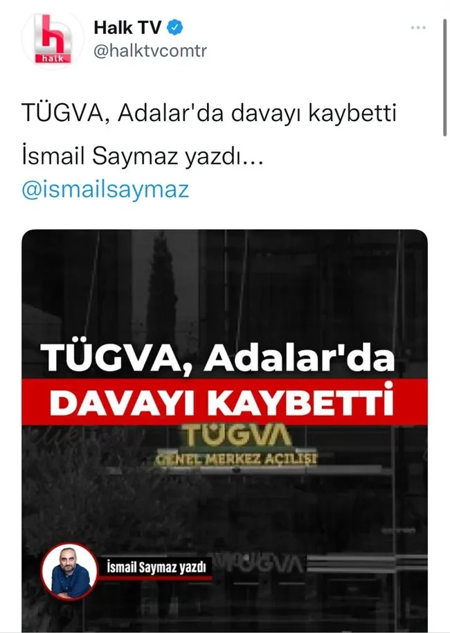 HALK TV’deki yazısında İsmail Saymaz, “TÜGVA, Adalar'da davayı kaybetti” başlıklı bir makale kaleme alarak bir yalana imza attı. Kimi internet siteleri de bu yalanı yaydı. TÜGVA yaptığı açıklamasında HALK TV ve İsmail Saymaz'ı yalanlayarak, “İlgili haberlerde lanse edildiği şekilde “davanın kaybedildiğine” ve “karara karşı hukuki yollara başvurulmayacağına”, “TÜGVA’nın binayı boşaltacağına” ilişkin iddialar ise yine tamamen gerçek dışıdır. Yetkisizlik kararına karşı hukuki yollara müracaat edeceğimiz gibi ayrıca İsmail Saymaz ve HALK TV’nin gerçek dışı haberine ilişkin tekzip, tazminat ve diğer haklarımızı kullanacağımızı da bildiririz” denildi