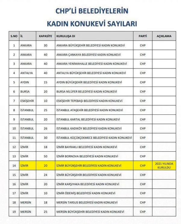 Seçimde "kadın sığınma evi sözü" veren CHP'li belediyeler sözleri tutmadı. Kılıçdaroğlu'nun 'Sığınma evi yapın' şeklindeki çağrısına karşın CHP'li 77 belediyenin sadece 19'unda kadın konukevi olduğu öğrenildi. 2019 seçim döneminden bugüne kadar sadece İzmir Büyükşehir Belediyesi yeni bir kadın konukevi açtı. CHP'li İstanbul Büyükşehir Belediye Başkanı Ekrem İmamoğlu'nun ise 7 Mart'ta yaptığı açıklamada 'açtık' dediği sığınma evinin aslında hiç yapılmadığı ortaya çıktı.