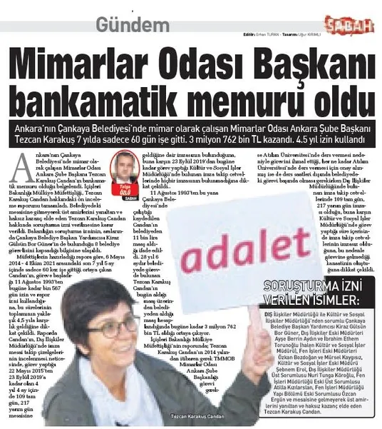 İçişleri Bakanlığı Yüksek Disiplin Kurulu'nun kararıyla devlet memurluğundan çıkarılan Mimarlar Odası Ankara Şube Başkanı Tezcan Karakuş Candan'ın, çalışma hayatı boyunca 1672 gün (yaklaşık 4.5 yıl) izin ve rapor aldığı ortaya çıktı. 7.5 yıldır Çankaya Belediyesi'nde mimar olarak çalışan Karakuş'un, 2020'de 245 gün, 2021 yılında ise 158 gün izin kullandığı, belediyenin turnike sisteminden 7.5 yıllık sürede sadece 60 kez geçtiği, imza föylerinde ise imzası olmadığı tespit edildi.