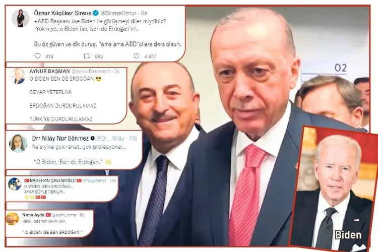 Başkan Recep Tayyip Erdoğan, Birlemiş Milletler Genel Kurulu'nda yaptığı konuşma sonrası beraberindeki heyetle koridorda yürürken kendisine soru sormak isteyen Reuters muhabiri Hatice Pamuk'a izin verdi. Pamuk, önce 'Biden'la görüşecek misiniz?' diye sordu. Erdoğan soruya 'Resepsiyona katılacağız' cevabını verdi. Ancak Reuters muhabiri bu kez provokasyona yönelerek sorusunu 'Ayrıca bir ikili görüşme yapmayı diler miydiniz?' şeklinde sordu? Erdoğan soruya, 'Niye? O Bıden ise ben de Erdoğan' yanıtını verdi. Bu anlara ilişkin görüntüler sosyal medyada kısa sürede binlerce kişi tarafından paylaşıldı ve Erdoğan'ın liderliği ve dik duruşuna övgüler yağdırıldı. İşte o mesajlardan bazıları: