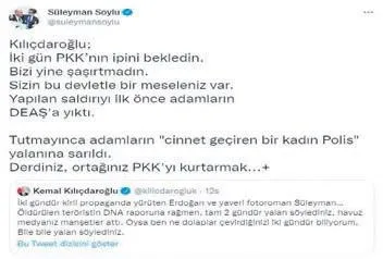 İçişleri Bakanı Süleyman Soylu, Mersin'de polisevine saldıran PKK'lı iki teröristten Dilşah Ercan'ın 'görevi başında' olduğunu duyuran terör örgütünün iddialarının peşinden giderek "DNA raporunu açıklayın" diyen CHP Genel Başkanı Kemal Kılıçdaroğlu'na 5 maddelik sert bir açıklamayla cevap verdi.