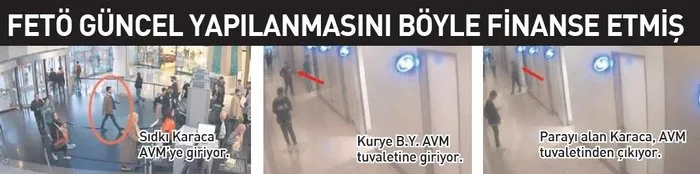 FETÖ'nün güncel finans yapılanmasına yönelik 59 ilde yapılan 'Gazi Turgut Aslan Operasyonu' kapsamında gözaltına alınanlar arasında yer alan ve Tahşiyecilere kumpas davasında terör örgütü yöneticiliğinden 18 yıl hapis cezası alan Samanyolu Yayın Grubu Başkanı Hidayet Karaca'nın oğlu olan Sıdkı Karaca'ya (26) AVM tuvaletinde düzenli para aktarıldığı ortaya çıktı. AVM tuvaletinde kurye ile buluştuğu anlara ilişkin görüntülere SABAH ulaştı. Görüntülere göre, FETÖ'nün İstanbul'da para kasası olarak belirlediği evin sorumlu yardımcısı olan B.Y., polisin teknik ve fiziki takip yaptığı sırada bir AVM'ye girdi.